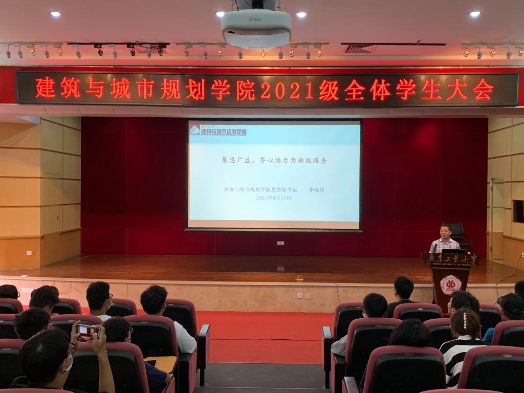 在图书馆8楼报告厅召开2021级新生班委培训会议,学院党委副书记李晓伟、2019级建筑学2班学生刘奕华和2021级全体班委参加会议,会议由学院2021级辅导员贾朝强主持。