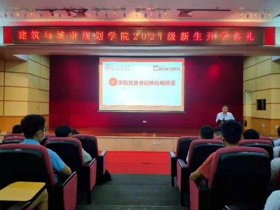 最后,钟兆明书记向2021级全体新生表示衷心的祝贺和热烈地欢迎,并对同学们提出几点希望:第一,要有理想信念,主动自己的人生价值主动融入中华民族伟大复兴和家国的繁荣兴旺之中;第二,要多读书、读好书,勤实践、增见闻,从书本和实践中汲取前人的智慧和经验,为塑造自己多彩的人生夯实基础;第三,学会做人做事。要尊师孝亲,始终有一颗感恩之心,用优异成绩报答父母恩师,与人为善,诚实正直,用诚心、善举照亮他人、温暖自己。钟书记最后代表学院全体教职工向新生们表示衷心的祝愿,引用习近平总书记在建党一百周年庆典上对青年的寄语表达对新生的期望。