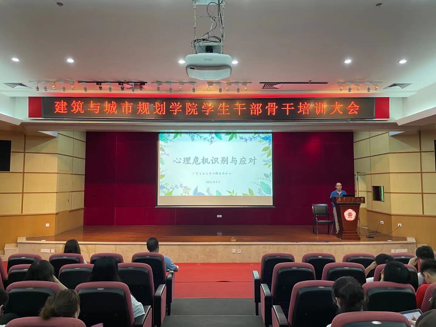 在图书馆八楼报告厅召开学生干部骨干培训大会,参与此次会议的有学校心理中心何春来老师、学院党委副书记李晓伟和全体辅导员老师,学院全体班委和宿舍长参加培训。