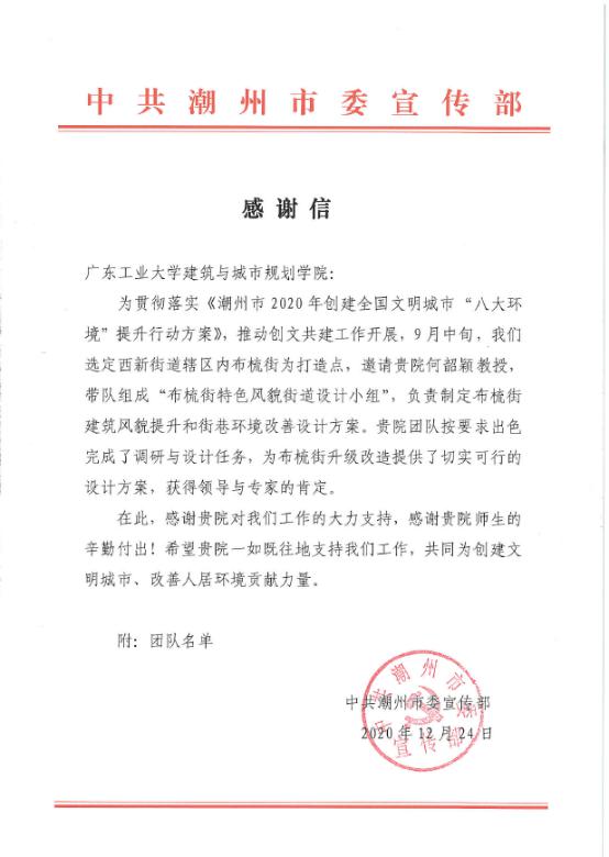 师生发来感谢信,感谢学院副院长何韶颖教授团队制定的潮州市布梳街建筑风貌提升和街巷环境改善设计方案,促进了潮州创文共建工作的开展。