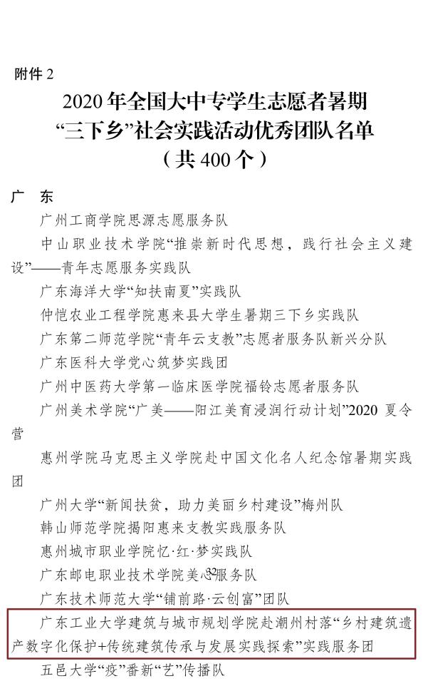 今年暑假,学院克服疫情困难,组织全院近70%的学生采用线上+线下融合的方式开展社会实践。实践中广泛依托专业教师的科研、教学研究基础,并借助政府力量,发动校友企业等社会资源,投入社会实践经费人均达99元,同步孵化各类成果。学院获得学校2020年暑期三下乡社会实践活动优秀组织奖、优秀实践队1支、优秀指导老师2名、优秀实践队员7名、优秀体会文章1篇,优秀调研报告3篇。学院赴潮州村落“乡村建筑遗产与数字化保护+传统建筑传承与发展实践探索”实践服务团(指导老师:何韶颖、刘悦、陈佳琪)获得2020年全国暑期三下乡社会实践优秀团队,是学院学生工作社会实践领域国家级奖项的首次突破!