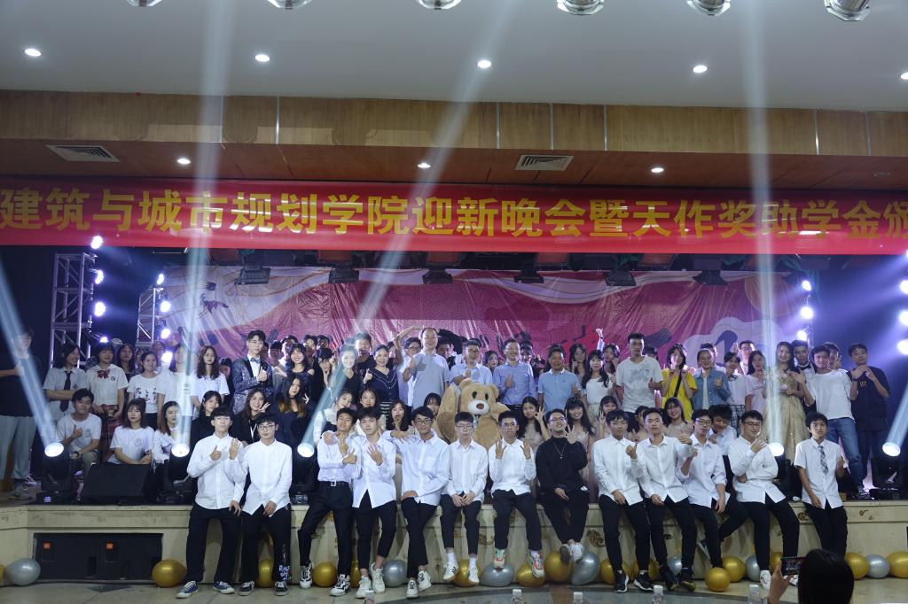 在东风路校区学生文化活动中心举办迎新晚会暨天作奖助学金颁奖典礼。广州市天作建筑规划设计有限公司副总规划师郑书剑先生、天作行政人力资源总监陈建聪先生、学院党委钟兆明书记、蔡云楠院长、李晓伟副书记、江海燕副院长、何韶颖副院长、陈素青老师、林垚广老师、马源老师、学院辅导员、2020级新生班主任以及校各学生组织代表们参加本次晚会。