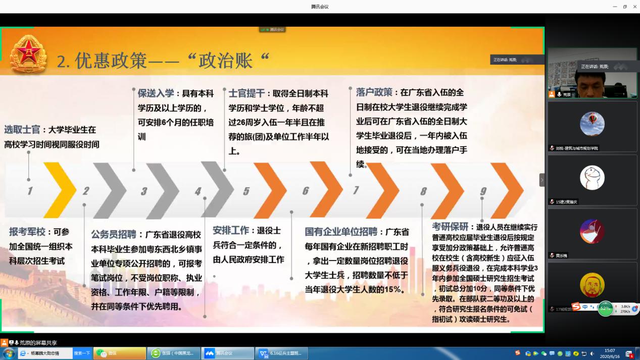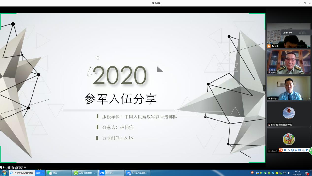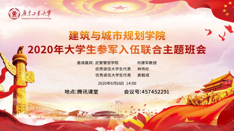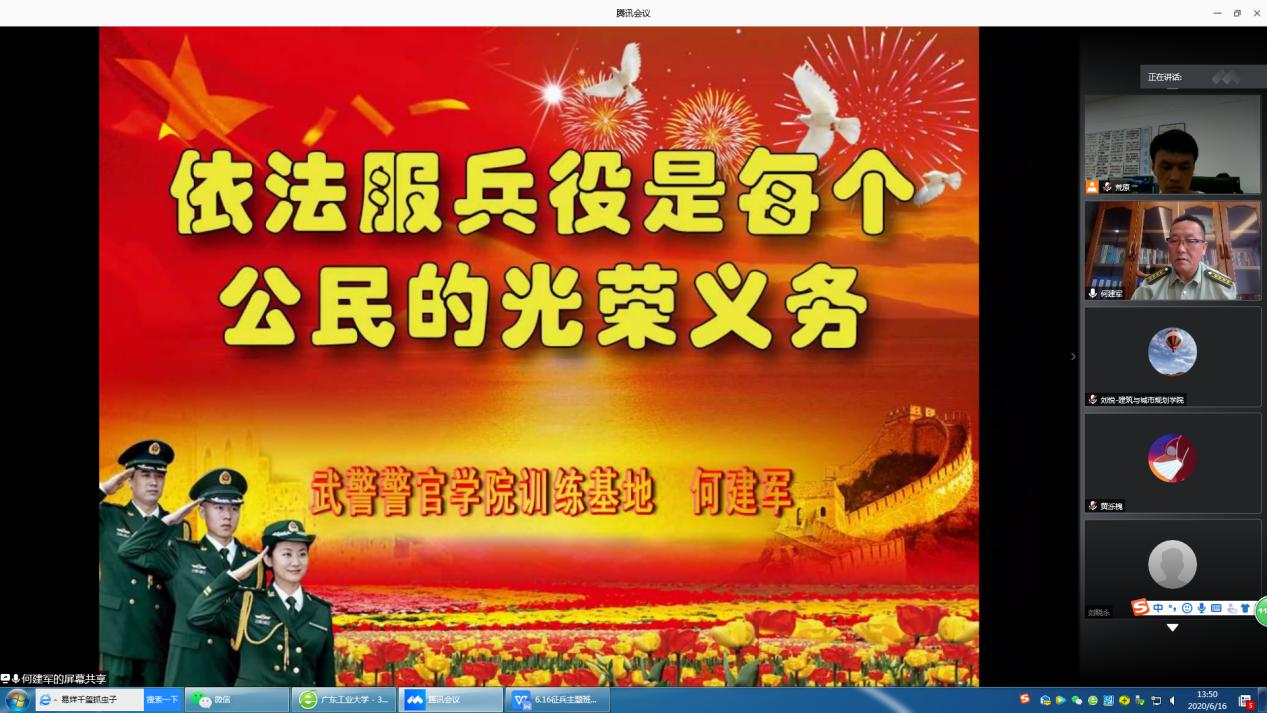 召开2020年大学生参军入伍线上联合主题班会,邀请武警警官学院何建军教授作征兵动员报告。参军退役大学生代表林伟伦、麦毅成,学院党委副书记李晓伟、学院团委书记刘悦和嗨皮漫画