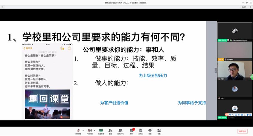 此次在线讲堂旨在帮助毕业生们积极准备求职、提升求职技能、合理定位就业期望,同时也为中低年级同学进行职业观念的培育和职业规划的引导,是我校就业创业课的实践活动内容之一,也是前期学校疫时我秀一分钟自我介绍视频大赛的赛中培训环节。