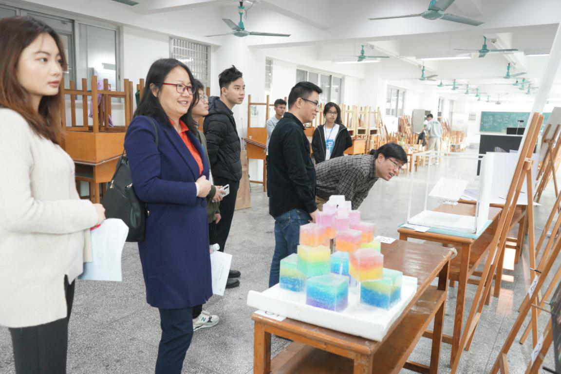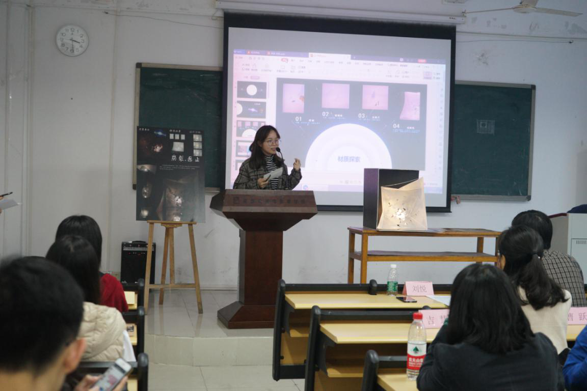 本次大赛分两轮进行,以“浮游”为大主题,“旋与聚”为小主题,并规定使用透明或半透明材料。在首轮评比中有8支队伍进入决赛答辩环节。作品《浮迹》别出心裁,单以亚克力板为材料并进行简单切割制造出虚幻而悬浮的感觉,获得评委一致认可;作品《寻星》在黑色大背景中固定不同大小的白色体量,将浮的效果体现得淋漓尽致,让在场师生大开眼界;作品《失衡生长》将立意上升到对社会的思考,引发师生们的热烈思考。评委老师从作品立意、材料选择、制作手法、展板布局等各个方面和各个环节进行了深入的点评和指导,让在场同学们思维更加开阔,模型制作技巧更加多元,为同学们提供了多方面的改进方向,让同学们受益匪浅。