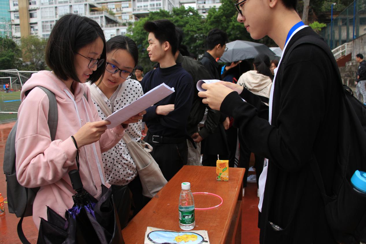 细雨蒙蒙,并没有阻挡同学参加趣味活动的热情,比赛上午9点正式开始。第一场比赛为乒乓接力,选手们在赛道用乒乓球拍顶着乒乓球进行奔跑接力,有的倾斜球拍,有的利用身体挡风,开动脑筋,灵活运用身体,全神参与其中。接下来是点球大赛,对手之间上演一场又一场精彩的攻守对决,全力的奔跑与迅速的抽射,引起了围观同学的阵阵惊呼喝彩。 第三场比赛是指点迷津,同学们需要戴上眼罩,在其他同学的指挥下绕过障碍,进行接力。这是最考验同学默契的项目,同时也出现了许许多多有趣的状况,欢笑声不断。第四场比赛是踩气球。两支队伍在限制区域和限定时间内踩爆对方更多的气球队伍获胜,比赛中选手们快速奔走,不断地找寻对方的破绽,周围的观众也在不断地提醒和呐喊,场面热闹非凡,活动达到了高潮。摊位游戏同样也是人满为患,在摊位前的长龙一直没有缩短过。时不时听到摊位游戏传来的欢呼声以及赢来班级积分地欢笑声。