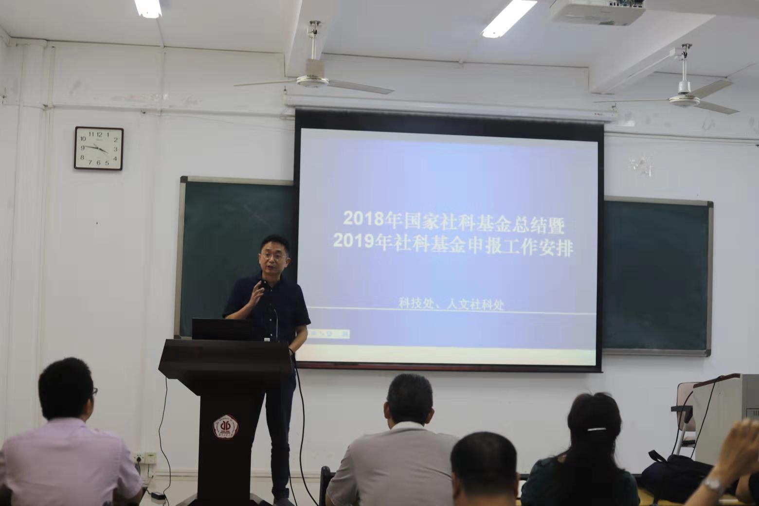 2018年国家社科基金的情况,并对2019年国家社科基金申报进行细致的讲解,他指出,学校完善的科研考核评价指标促进了学校科研的快速发展,高水平科研团队是建设高水平大学的抓手,要重视科研团队的建设,加强基础研究,促进学院学科发展,提升学院科研创新原创能力,推进高水平论文和科技成果的转化,为我校高水平大学建设贡献力量。