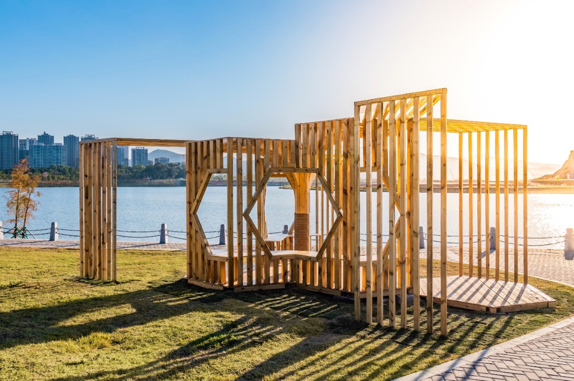 该作品整体形态优美、舒展,与周边环境完美融合,空间虚实变化丰富,六边形元素纯粹简洁,模块化设计具有独创性,座椅设置多样,休憩空间充分。移步易景,供游客打卡的功能性突出,小品中别出心裁地设置了数个“取景框”,背后是一幅幅九龙湖特色风景画,充分呼应了题目的功能要求,结构稳定性高,细部如麻绳绑扎等处理佳。作品整体可拓展性、可复制性强。