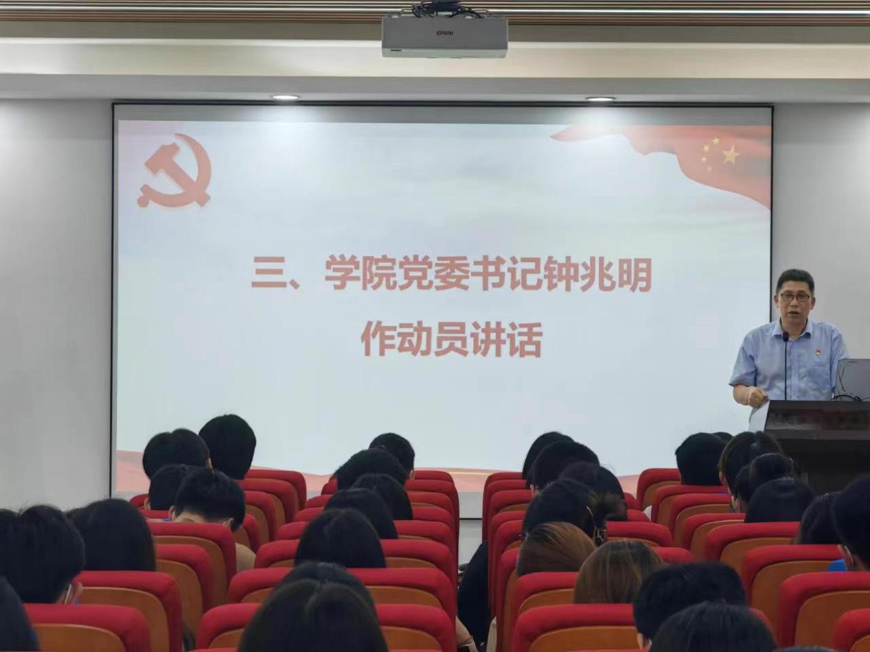会上,钟兆明作了动员讲话。他传达了邱学青校长在学院调研会上的讲话精神,介绍了近年学校、学院取得的成绩。学院的进步离不开包括学生党员在内的全院师生的共同努力,在党员同学的带动下,学院在创新创业竞赛、学生组织建设、班风学风建设、学生安全稳定工作等方面都保持了良好的态势。当前,学院正处于发展新阶段,需要全院师生党员付出更大的努力。古语有云:“正人先正己,己不正则不能正人。”党员同学要把自己的成长融入到为党做事、服务他人的工作中。党员同学为同学们服务,既是在践行党全心全意为人民服务的宗旨,解决同学们的实际困难,也是在锻炼自己的能力、磨砺自己的品德、培养自己的格局。希望全体学生党员要进一步发挥先锋作用,要在学习、工作、生活、服务等四个方面成为表率。学院启动了“先锋行动”,实施“三个1”措施,对需要党员同学开展的工作进行量化,并进行考核。每个党员要在支部每月举行的主题活动上通报自己的情况、在支部每学期的会议上进行总结、在支部每年的党员评议上进行评议。目的是让同志们在服务学生中培养党员的责任意识、担当精神,锤炼学生党员的战斗力,促使党员同学全面发展,率先成为一名德智体美劳全面发展的优秀人才。
