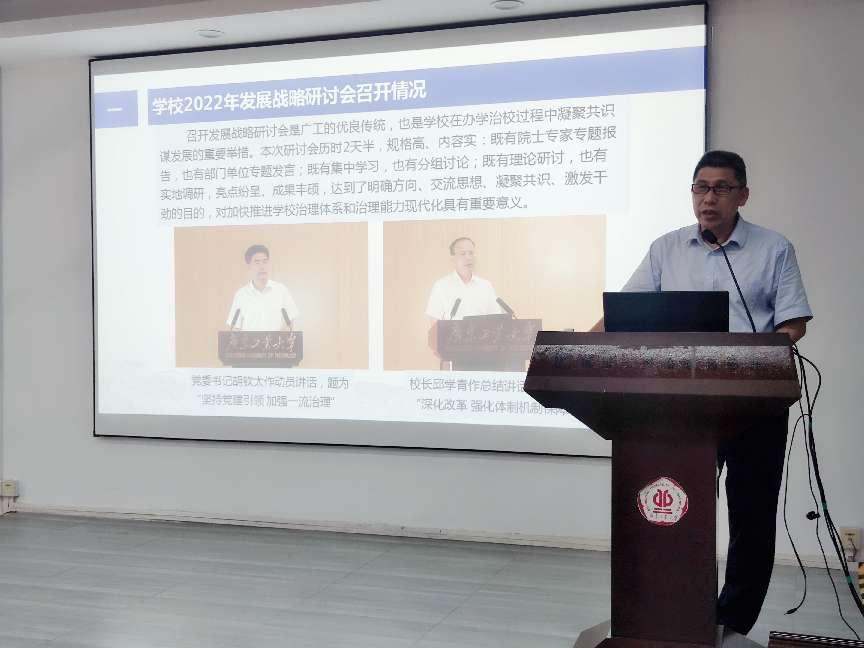 会上,钟兆明书记传达了学校2022年发展战略研讨会的主要精神,带领全体教职工重点学习了胡钦太书记和邱学青校长在2022年学校发展战略研讨会上的讲话内容,希望学院全体师生员工要不忘立德树人初心,牢记为党育人、为国育才使命,凝心聚力,紧抓机遇,努力提升自己的科研能力和教学能力,适应学校创新型体制机制改革发展需求,在新的学年取得更好的成绩。