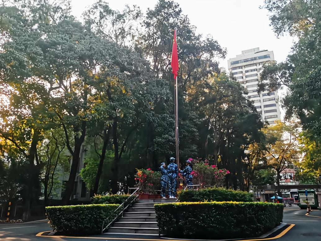 红日初升,惠风和畅。全体师生庄严肃立,行注目礼,齐声高唱《义勇军进行曲》,鲜艳的五星红旗在嘹亮的国歌声中冉冉升起,随风飘扬。