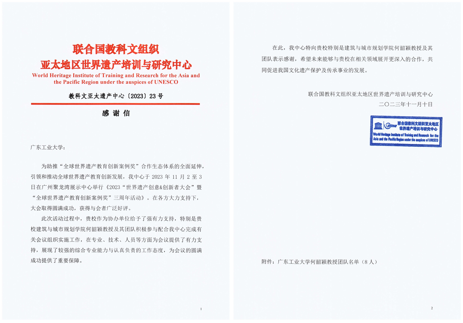 教科文亚太遗产中心 感谢信