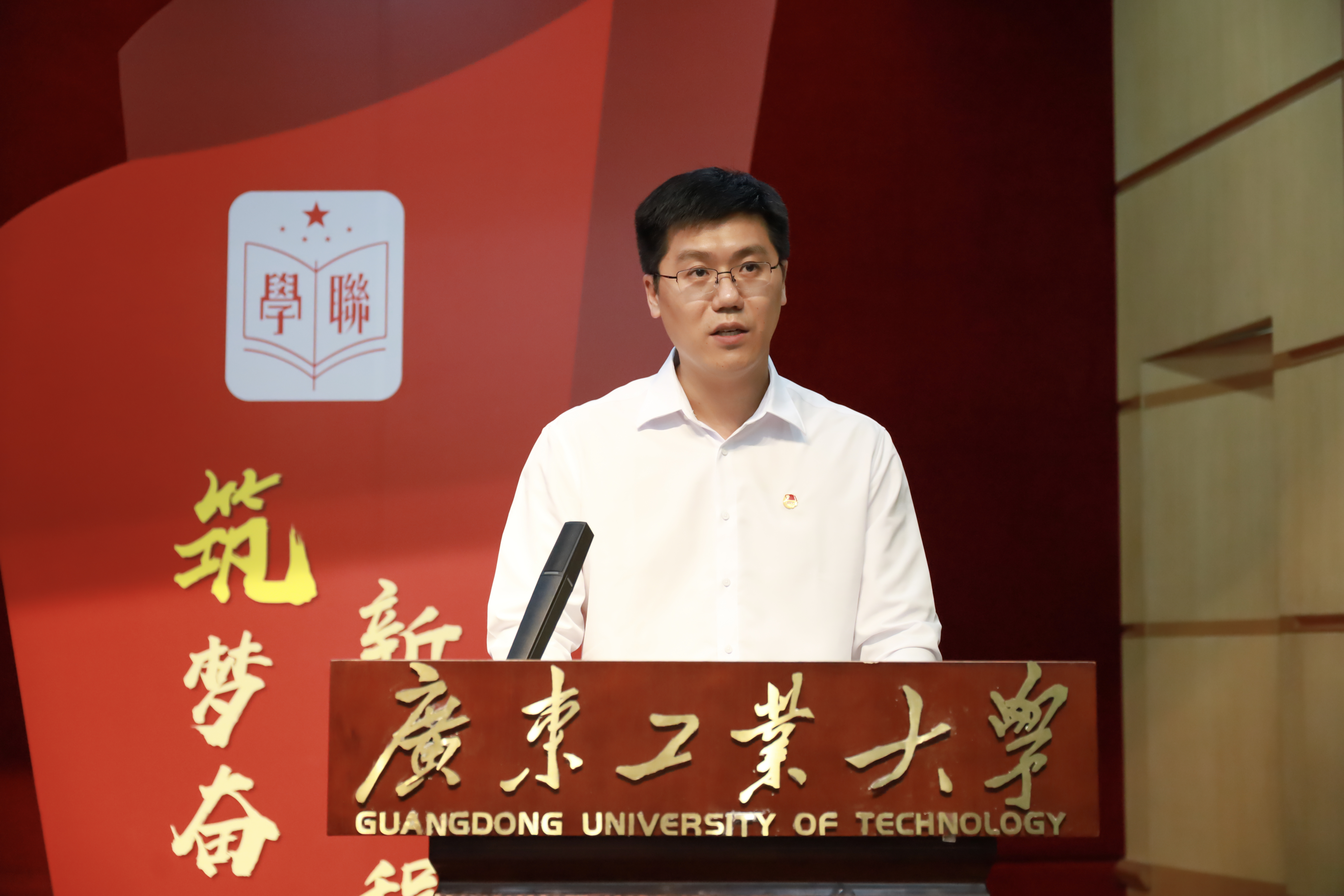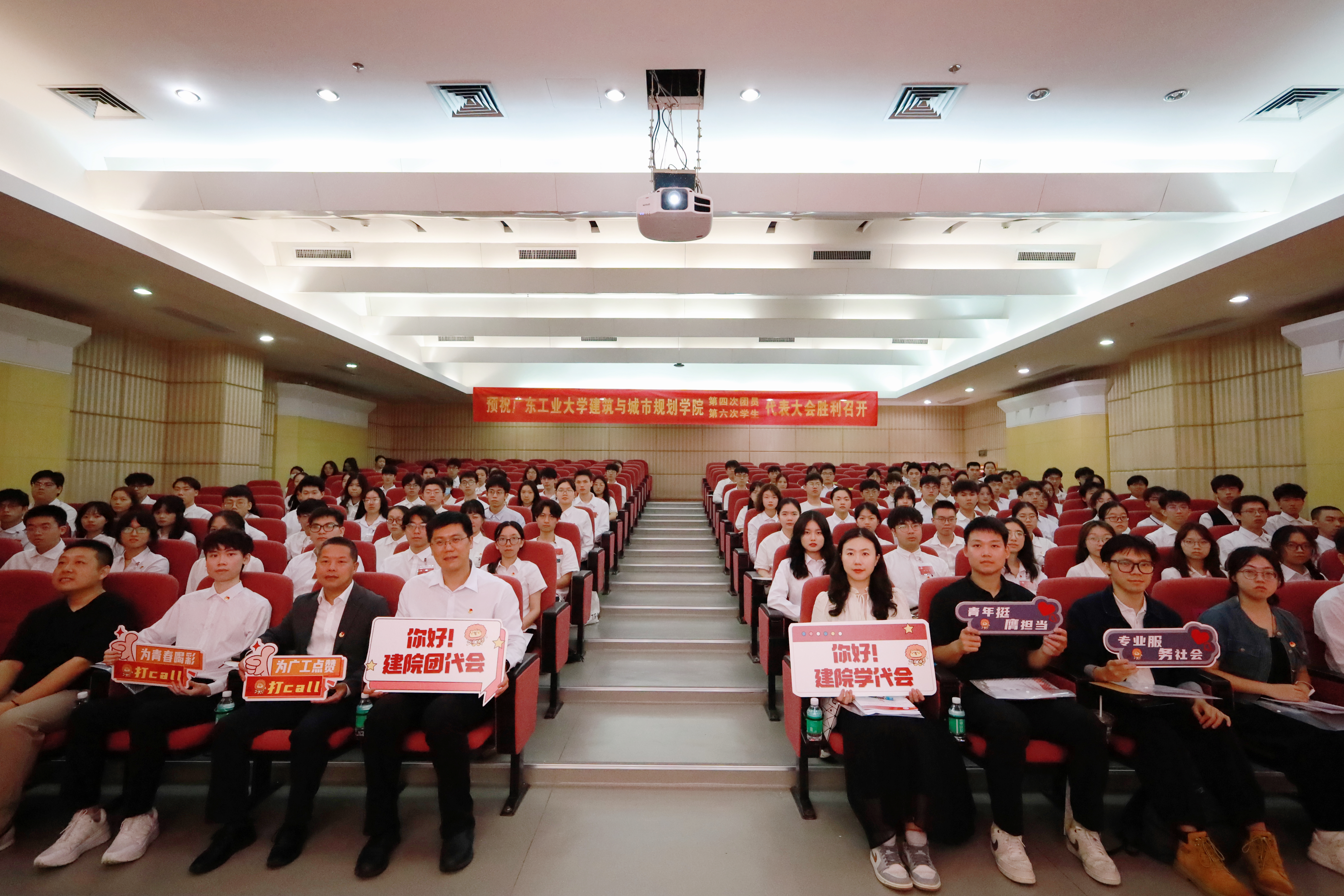 大会在高昂庄严的国歌声中拉开帷幕。吴振铨在大会上致辞,他首先充分肯定了近年来学院团学工作所取得的成绩。学院团学工作紧紧结合学科特色,开展了具有鲜明专业特点的思想引领工作,取得了多个“首次”,在全校团学工作中发出了“建院声音”,形成了“建院品牌”。学院创新创业成绩斐然,每年有国奖;志愿服务成效显著,“爱的建筑师”项目在第六届中国青年志愿服务项目大赛中荣获铜奖,学院被省委宣传部命名为“第十批广东省学雷锋活动示范点”;学院师生积极投身广东省“百千万工程”中,为乡村振兴贡献建院青春力量。他还对学院团学工作提出三点希望,第一是要筑牢思想根基,永远听党话、跟党走,把身边青年团结起来、组织起来、动员起来,在学校高质量发展中勇当先锋队、突击队。第二是要围绕中心工作,不懈求真知、长才干,在自己所能的领域找准着力点,扬长避短、形成特色、发挥优势。第三是要坚守家国情怀,始终敢挑战、勇攀撑。让青春在党和人民最需要的地方绽放绚丽之花!