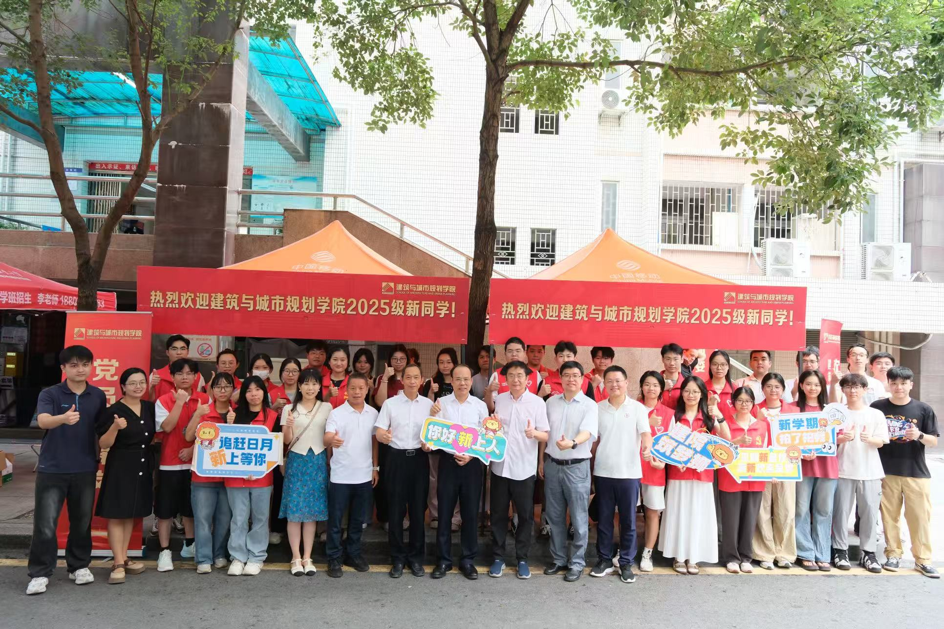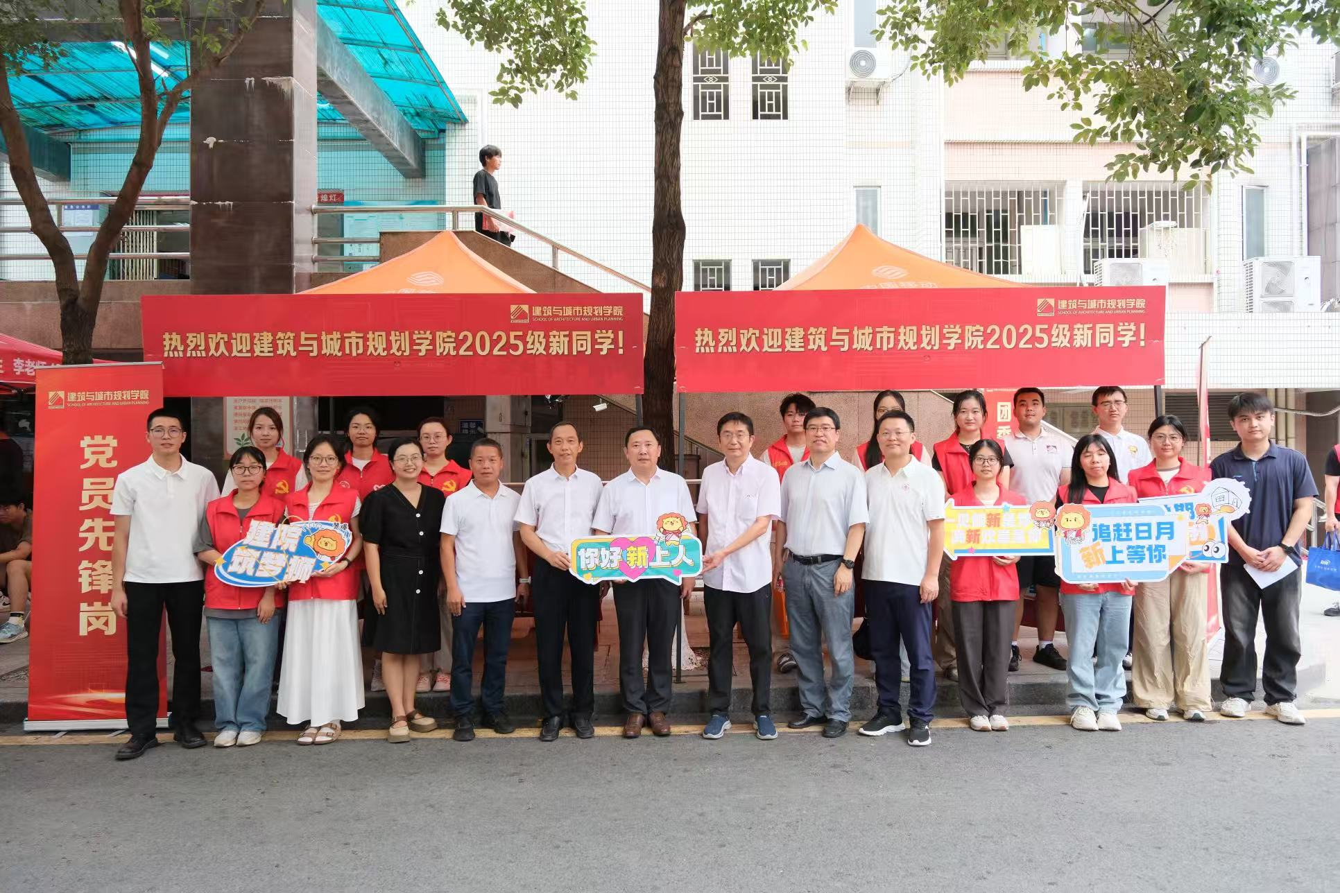 新生迎新点与学生党员先锋队、迎新志愿者等进行亲切交流并合影。
