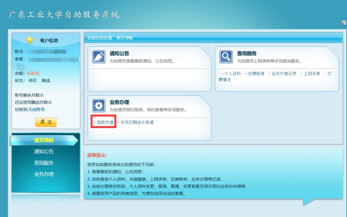 4、点击“网络开户续费”,如未开户的用户,平台跳转至“办理开通上网”页面,按要求填写所有信息提交并支付开户费后,账号即开通;已开户的用户平台跳转至主界面,通过“业务办理-自助充值”按钮进入充值页面(见图二),用手机微信扫码等即可完成网费充值相关操作。(为避免错充他人账号,支付前务请确认清楚为本人账号及姓名,否则责任自负;成功支付后通常可在10分钟内到账;充值完成后请退出系统,并关闭操作页面)
