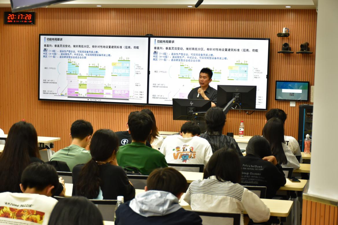 彭健明校友介绍了专项债政策研究、广东双十产业规划以及佛山与惠州的产业布局规划等项目,详细分析了多个产业园案例,通过对多个新型产业园区的观察与总结,彭健明校友表示现代绿色智慧园区的发展趋势将从关注生产、生产空间转变为关注产城人文的融合。随后,他详细讲解了绿色智慧园区设计的总体规划,包括设计思路、功能配比构成和布局要求以及建筑细部设计等一系列知识。